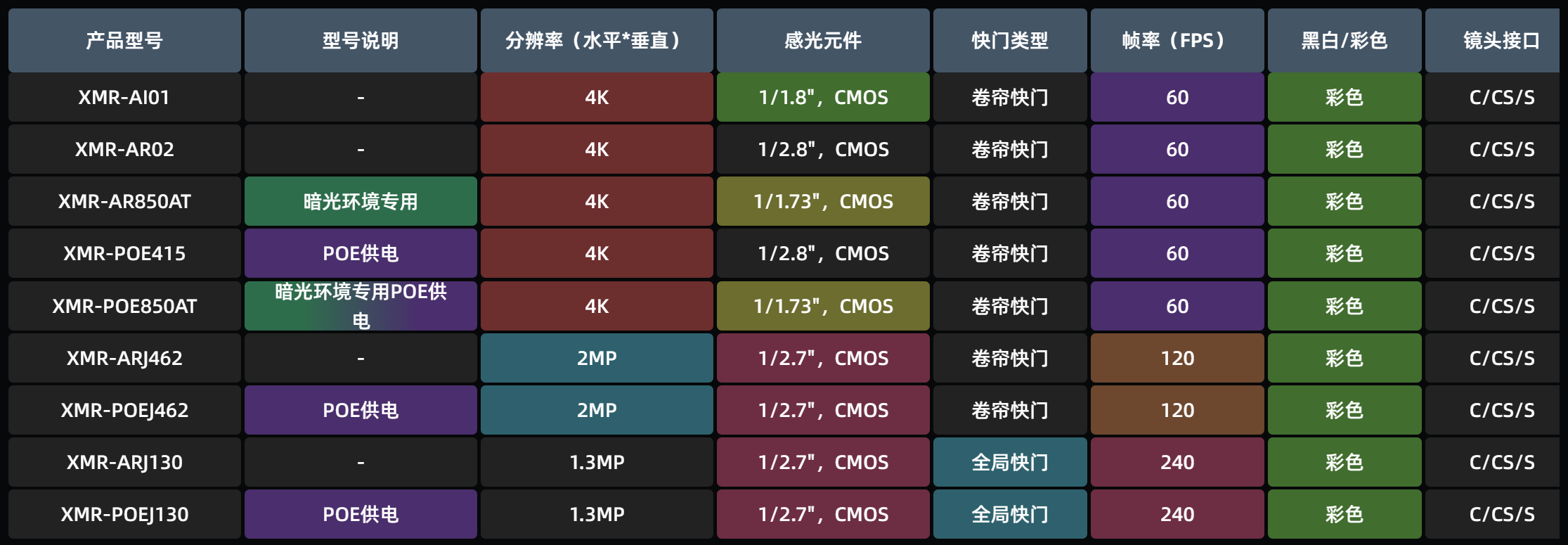 各型号产品参数